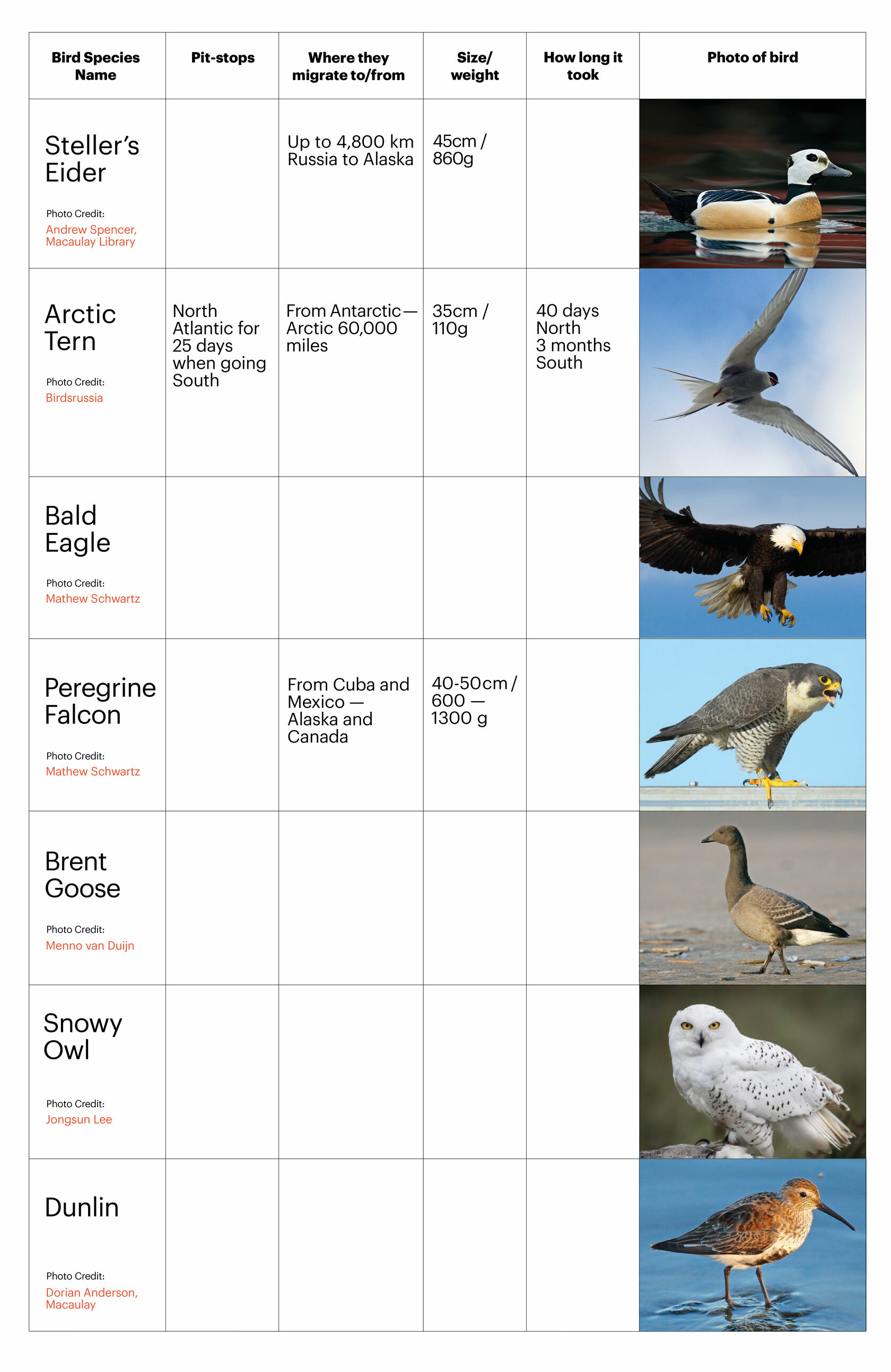 Plot where birds that migrate to the Arctic come from and how far they travel. How long did it take to do the journey? Some examples are already given in the table below. Can you find the missing information?